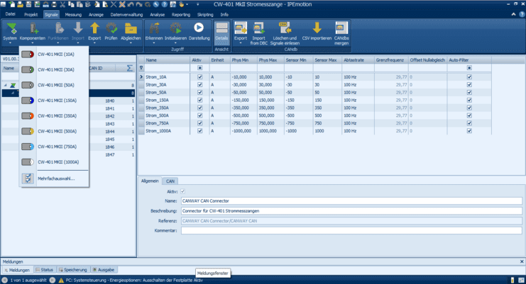 Neben der CW-969 Konfigurationssoftware für die CW-401 MkII Strommesszangen stellt CANWAY ein PlugIn für die Data Akquisition Software IPEmotion zur Verfügung. Über das PlugIn können Parameter, wie z. B. CAN-ID, Ausgaberate oder Signalname komfortabel konfiguriert werden. Durch den einheitlichen CAN ISO 11898-2 V2.0A oder 2.0B Standard können Messmodule von IPETRONIK und CW-401 MkII Strommesszangen an einem CAN-Bus Interface betrieben und gemessen werden. Das neue Release V01.00.49 beinhaltet Funktionserweiterungen, wie z. B. Auto-Filter und einer Buslastanzeige, um die Auslastung des CAN-Busses beurteilen zu können.