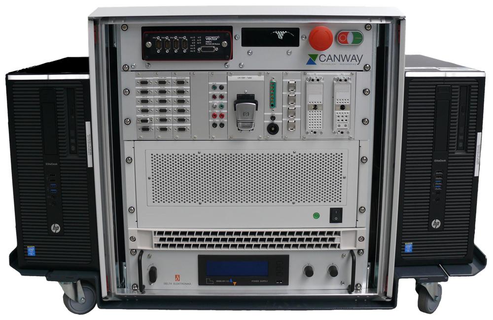 So sind u.a. mehrere Bedienelemente im Prüfstand integriert. Neben realen Komponenten sind ebenfalls Elektronik-Komponenten zur gezielten Simulation von Fehlern (z.B. Failure Injection Unit) im Prüfstand vereint. Der Anwender des Prüfstandes ist somit in der Lage, komplexe Funktionen direkt zu testen. Bei CANWAY wird dabei viel Wert auf Flexibilität, im Sinne von nachträglichen Erweiterungs- und Änderungsmöglichkeiten gelegt. Dies ist sinnvoll, um den dynamischen Anforderungen moderner Entwicklung Rechnung zu tragen. Der Prüfstand verfügt über ein modulares Einschubsystem mit dem weitere Baugruppen integriert, erweitert oder geändert werden können.