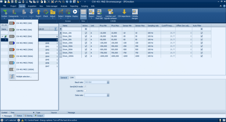 In addition to the CW-969 configuration software for the CW-401 MkII current clamps, CANWAY also provides a plug-in for the IPEmotion data acquisition software. Parameters such as CAN ID, output rate or signal name can be conveniently configured via the plug-in. Thanks to the standardised CAN ISO 11898-2 V2.0A or 2.0B standard, measurement modules from IPETRONIK and CW-401 MkII current clamps can be operated and measured on a CAN bus interface. The new release V01.00.49 includes functional enhancements such as auto-filter and a bus load display to be able to assess the utilisation of the CAN bus.