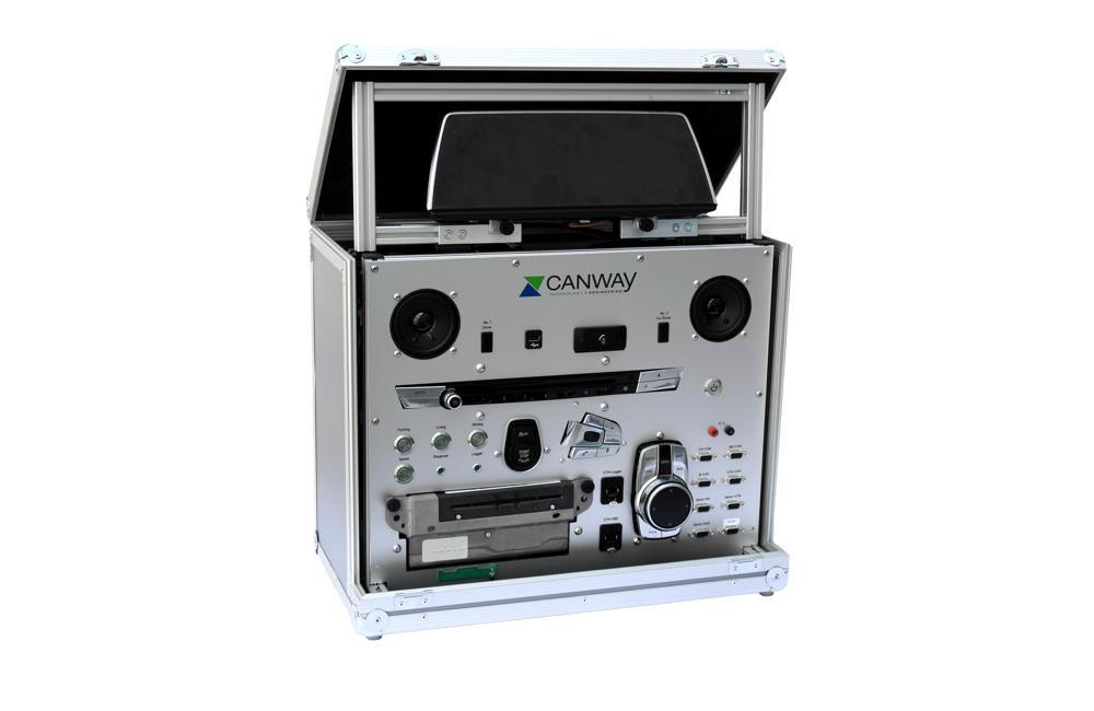The portable infotainment test bench in a case was ordered by a well-known automotive OEM and designed, developed and fabricated by CANWAY at the customer's request. Today, different design variants of the portable HiL test bench are utilized to integrate modern infotainment applications. The test bench realistically visualizes the majority of components in an automotive infotainment system.