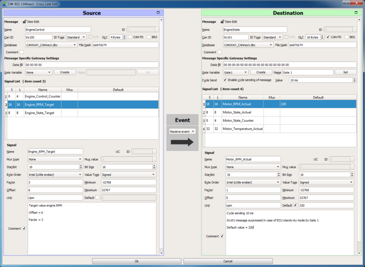 With the intuitively designed configuration software CW-921 it is possible to map and comprehensively configure messages and signals according to requirements. The routing features of the gateway are implemented in the so-called cross links via user-friendly drag-and-drop operations, see figure opposite.